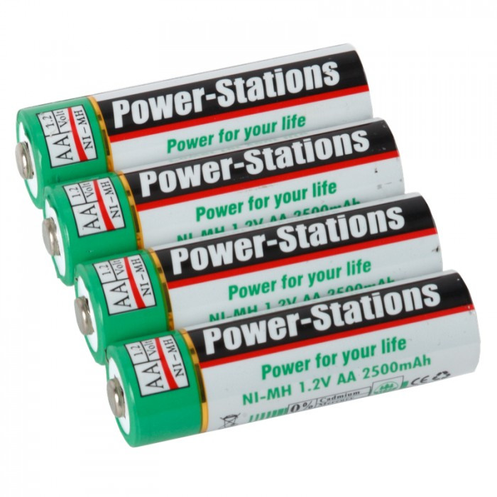 The Power-Stations battery pack contains 4 AA nickel-metal hydride (Ni-MH) rechargeable batteries. Each has a voltage of 1.2V with a capacity of 2500mAh. These memory free batteries can be recharged up to 1000 times and have an excellent high-drain performance.