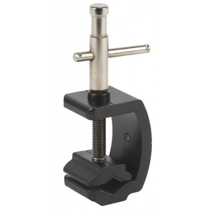 This pipe clamp will allow you to mount monolights, LEDs, or any device with a 5/8" mount. The clamp will fit onto pipes or tables up to 1.75 inches thick. The clamp features two mounting points: a 5/8" stud at the end, and a 3/8"16 female thread at the back of the clamp.