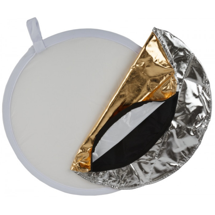 The 22" 5-in-1 Light Disc kit is made up of a translucent light disc with a four-sided cover. The reversible cover has a Silver, Black, Gold and White reflective sides. The translucent disk can be used to diffuse harsh sunlight. The silver side of the cover can bounce cool light to add contrast and fill in shadows. With the gold side, light can be reflected to add warm tones to the subject. To reflect neutral colored light to fill in shadows, the white side can be used. The black side can be used to block unwanted light.