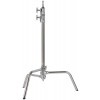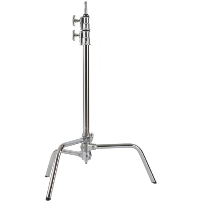 This three-section chrome C-stand has a maximum height of 52.75" (132 cm), a minimum height of 31.5" (80 cm), and weighs 12 pounds (5.4 kg). The feet feature non-marring plastic ends to protect floors. On the top of a stand is a baby pin to attach clamps, arms, and other accessories.