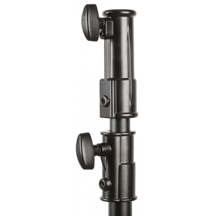 This double riser stand extends from 46 inches to 7 feet and features a junior adapter on the top. The stand comes with a set of casters that allow you to easily move the stand around the studio. Each caster has a lock that can be engaged to keep the stand in place. The risers and legs are made from durable steel.